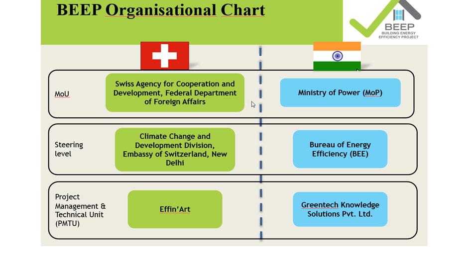 Das BEEP Projekt ist eine bilaterale Zusammenarbeit zwischen dem Energie Ministerium der Indischen Regierung und dem Eidgenössischen Departement für auswärtige Angelegenheiten (EDA) der Schweizer Bundesverwaltung. Ziel dieser Kooperation ist (sowohl) das Reduzieren des Stromverbrauches in neuen, gewerblichen Bauten als auch das Verbreiten von Beispielen und Ideen für die Konstruktion nachhaltiger Wohnhäuser und öffentlicher Bauten in Indien. Zum Erreichen dieser Ziele braucht es einen ganzheitlichen Designansatz. Das Expertenteam besteht aus erfahrenen Ingenieuren, Architekten, Wissenschaftlern und Beamten aus nachhaltigen Fachbereichen.