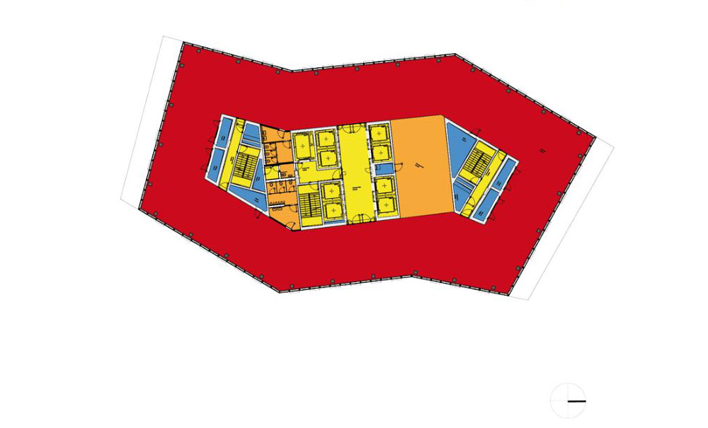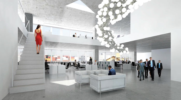 Im Erdgeschoss stehen rund 2500 Quadratmeter für Gastronomie und kommerzielle Nutzungen zur Verfügung. Im ersten Obergeschoss sind Büroräumlichkeiten (3000 Quadratmeter) vorgesehen, in der zweiten und dritten Etage entstehen weitere Büro- und Atelierflächen.