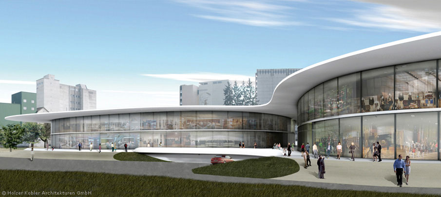 Wright Place der Architekten Matti Ragaz Hitz bietet an prominenter Lage im Opfiker Stadtteil Glattpark Platz für Arbeiten, Shopping, Restaurants, Fitness und Wohnen.